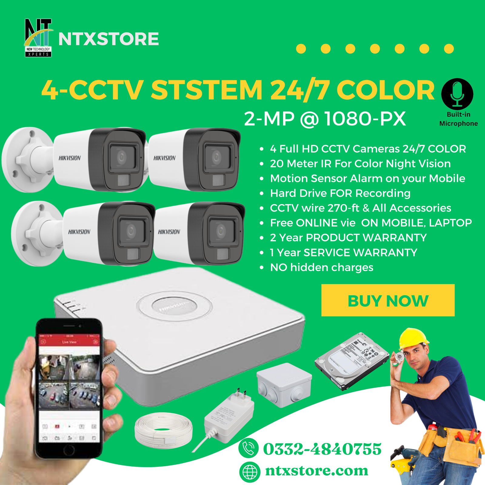 Experience ultimate security with the Hikvision 4-CCTV System featuring 24/7 Color Full HD surveillance. Designed for superior performance, this system offers high-quality monitoring to protect your property at all hours of the day and night.